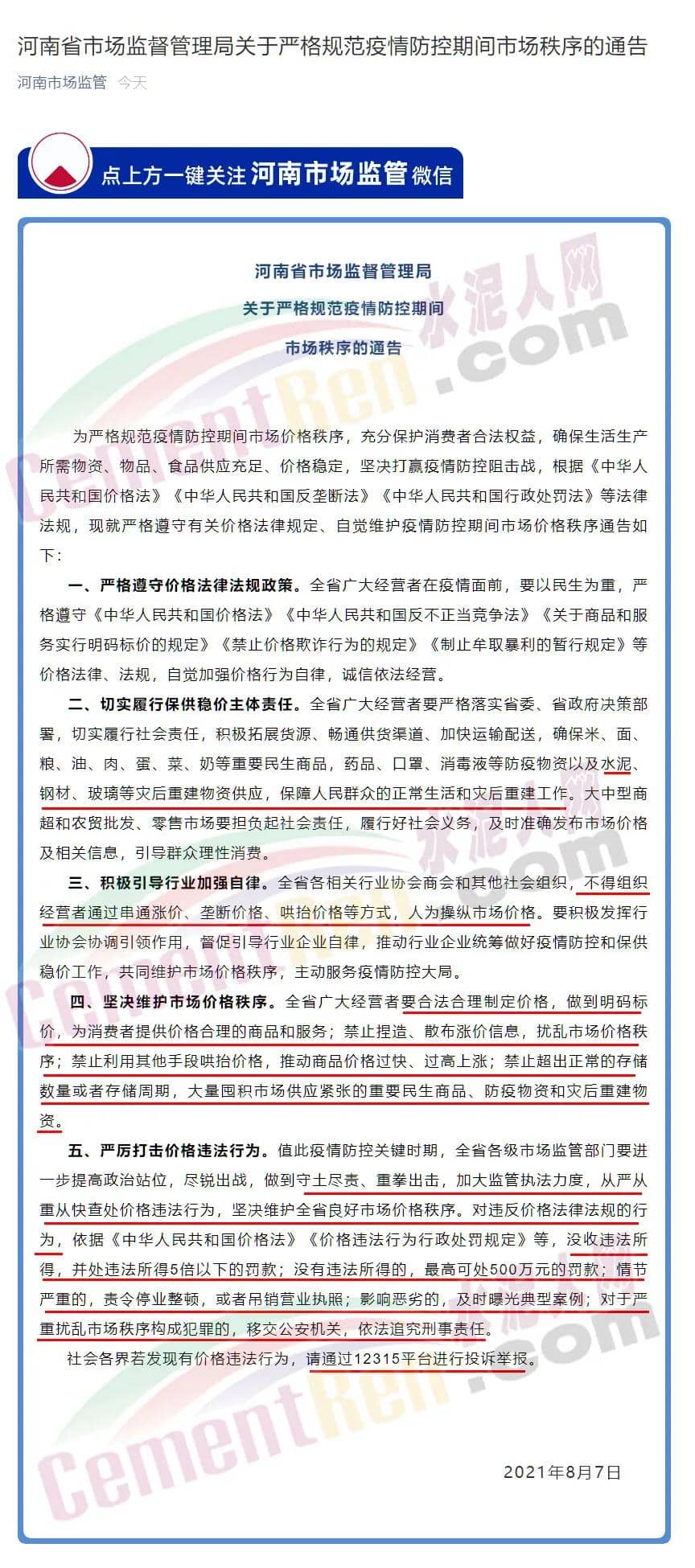 8月7日河南省市場監督管理局發布《關于嚴格規范疫情防控期間市場秩序的通告》稱,為嚴格規范疫情防控期間市場價格秩序,充分保護消費者合法權益,確保生活生產所需物資、物品、食品供應充足、價格穩定,堅決打贏疫情防控阻擊戰,根據相關法律法規,就嚴格遵守有關價格法律規定、自覺維護疫情防控期間市場價格秩序作出通告。