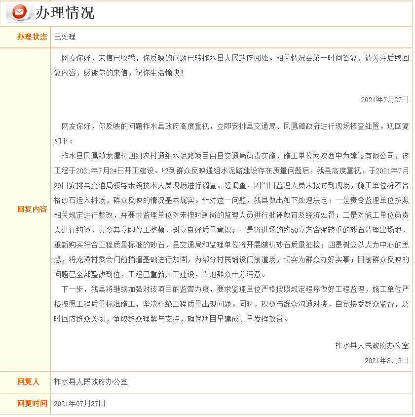8月3日,柞水縣人民政府辦公室作出回復,柞水縣政府高度重視,立即安排縣交通局、鳳凰鎮政府進行現場核查處置。并回復如下: