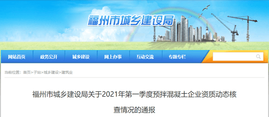 福州城鄉(xiāng)建設(shè)局《關(guān)于2021年第一季度預(yù)拌混凝土企業(yè)資質(zhì)動(dòng)態(tài)核查情況的通報(bào)》