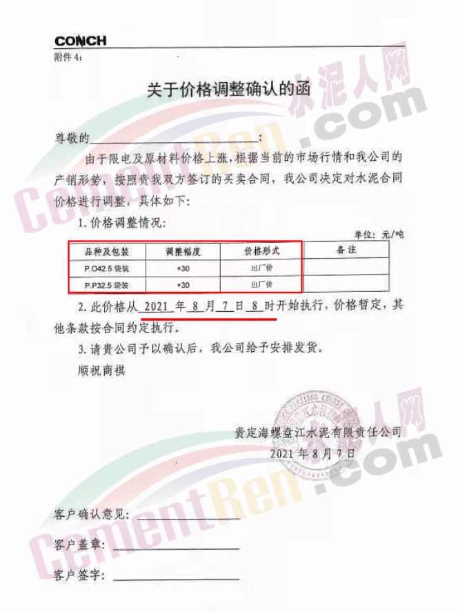 同日,企業又通知根據市場行情變化,經公司研究決定,自2021年8月7日上午8時起,凱里、雷山區域各品種袋、散裝水泥銷售價格在原基礎上上調35元/噸;丹寨、都勻、麻江區域各品種袋、散裝水泥銷售價格在原基礎上上調30元/噸。