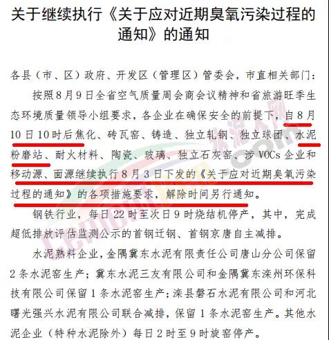 通知稱,按照8月9日全省空氣質(zhì)量周會商會議精神和省旅游旺季生態(tài)環(huán)境質(zhì)量領(lǐng)導(dǎo)小組要求,各企業(yè)在確保安全的前提下,自8月10日10時(shí)后焦化、磚瓦窯、鑄造、獨(dú)立軋鋼、獨(dú)立球團(tuán)、水泥粉磨站、耐火材料、陶瓷、玻璃、獨(dú)立石灰窯、涉VOCs企業(yè)和移動源、面源繼續(xù)執(zhí)行8月3日下發(fā)的《關(guān)于應(yīng)對近期臭氧污染過程的通知》的各項(xiàng)措施要求,解除時(shí)間另行通知。