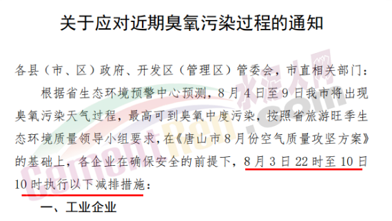 8月10日,唐山市大氣污染防治工作領(lǐng)導(dǎo)小組辦公室又發(fā)一文,即關(guān)于繼續(xù)執(zhí)行《關(guān)于應(yīng)對近期臭氧污染過程的通知》的通知。