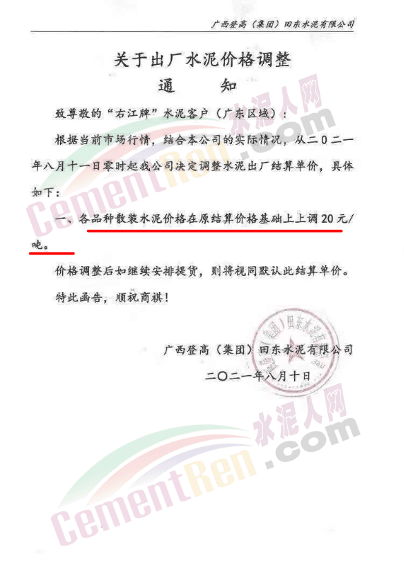 水泥人網(wǎng)通訊員消息:8月10日,廣西登高(集團(tuán))田東水泥有限公司通知根據(jù)當(dāng)前市場行情,結(jié)合公司的實(shí)際情況,從8月11日零時起公司決定調(diào)整廣東區(qū)域水泥出廠結(jié)算單價。各品種散裝水泥價格在原結(jié)算價格基礎(chǔ)上上調(diào)20元/噸。價格調(diào)整后如繼續(xù)安排提貨。