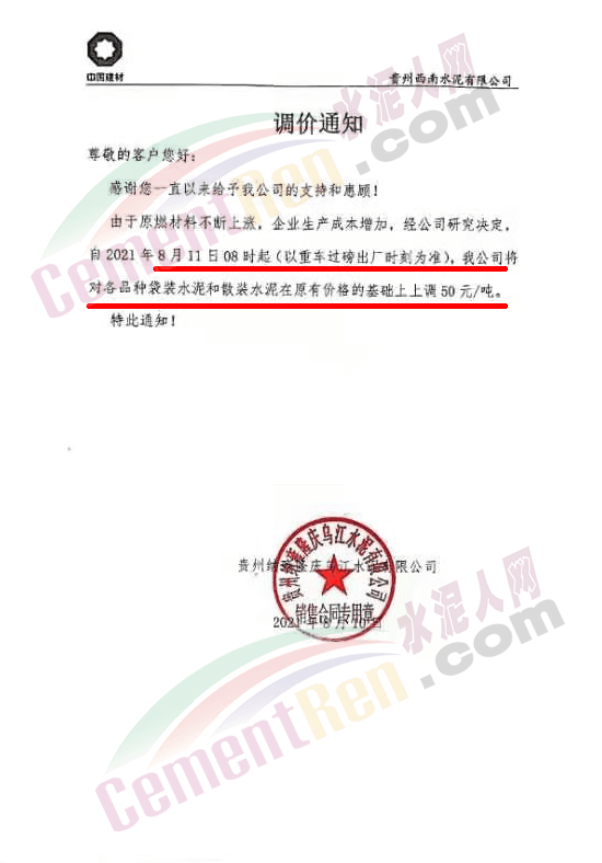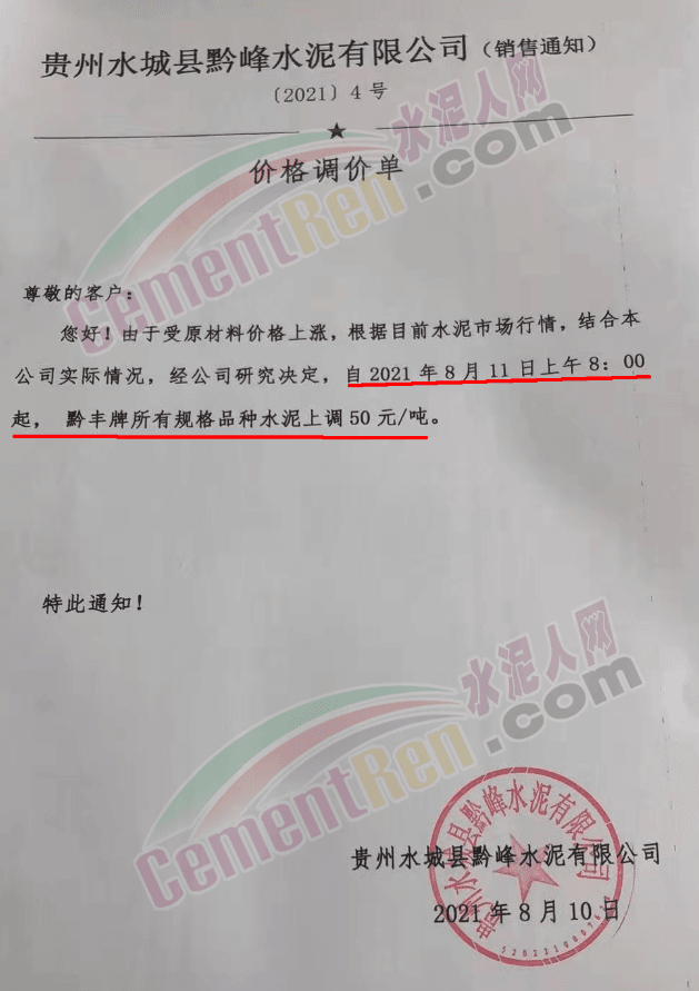 8月10日,貴州水城縣黔峰水泥有限公司通知,由于受原材料價格上漲,根據(jù)目前水泥市場行情,結(jié)合本公司實(shí)際情況,經(jīng)公司研究決定,自8月11日上午8時起,黔豐牌所有規(guī)格品種水泥上調(diào)50元/噸。