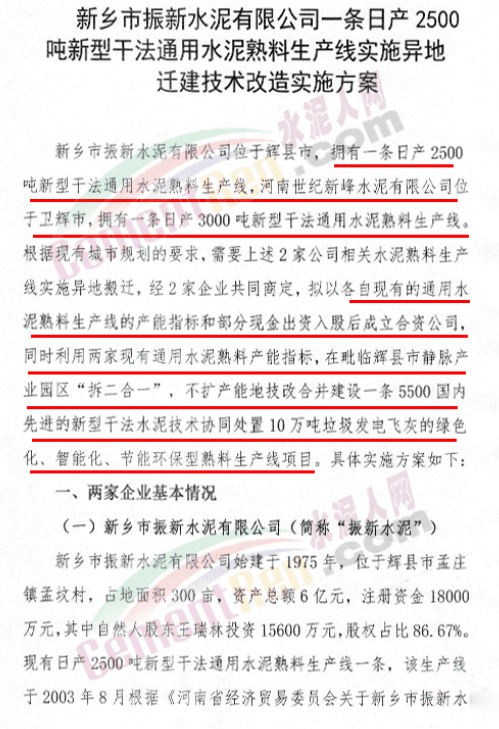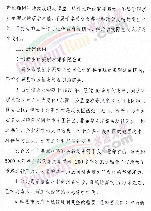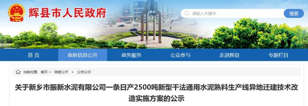 日前,河南新鄉輝縣市人民政府發布《關于新鄉市振新水泥有限公司一條日產2500噸新型干法通用水泥熟料生產線異地遷建技術改造實施方案的公示》。