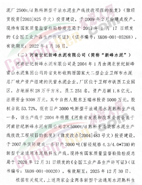 公示文件提到,新鄉市振新水泥有限公司與河南世紀新峰水泥有限公司擬投資10億元,以各自現有的通用水熟料生產線的產能指標和部分現金出資入股后成立合資公司,同時利用兩家現有通用水泥熟料產能指標,在毗臨輝縣市靜脈產業園區“拆二合一”,不擴產能地技改合并建設一條5500t/d國內先進的新型干法水泥技術協同處置10萬噸垃圾發電飛灰的綠色化、智能化、節能環保型熟料生產線項目。