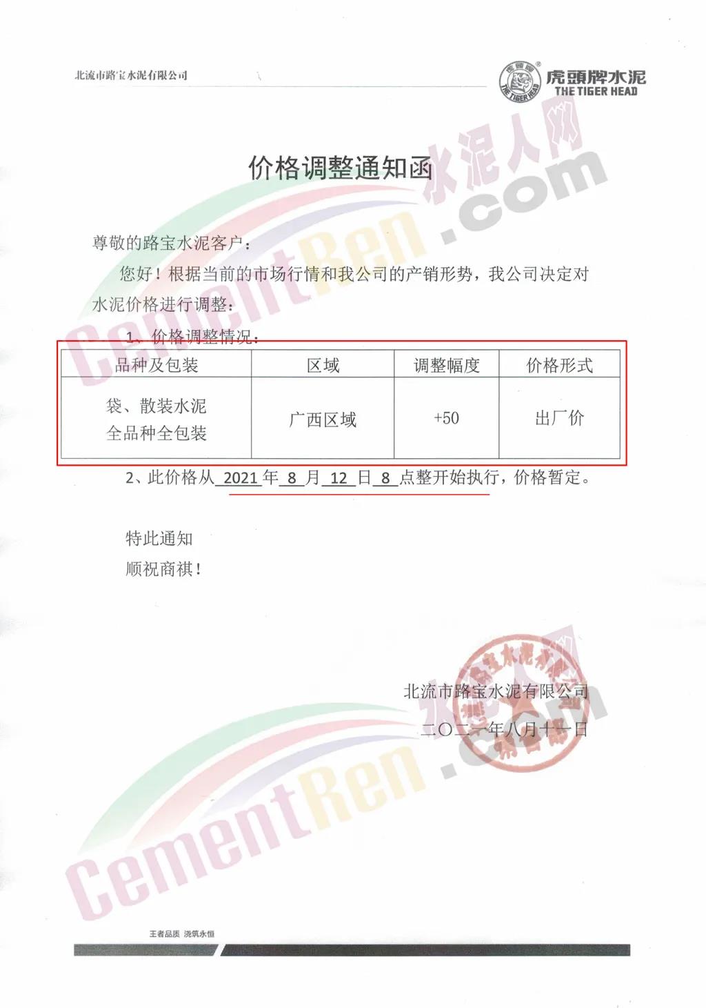 根據近期市場形勢,我司決定于2021年8月13日00:00起,對全廣西區域的全品項水泥價格上調50元/噸。