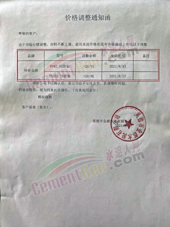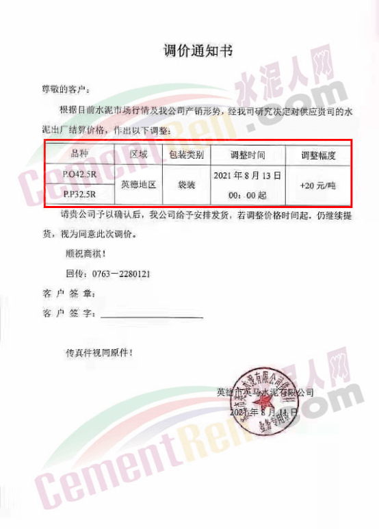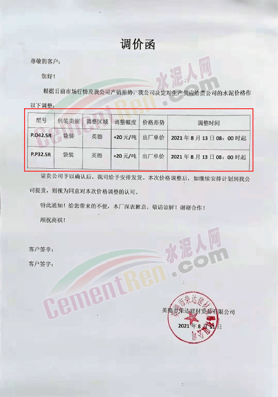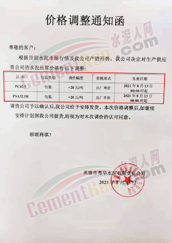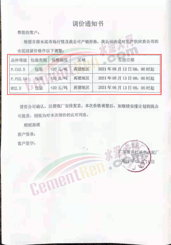 廣東省英紅華僑水泥廠通知,自8月13日8時起P.C42.5及P.P32.5R包裝水泥對英德地區上調20元/噸。