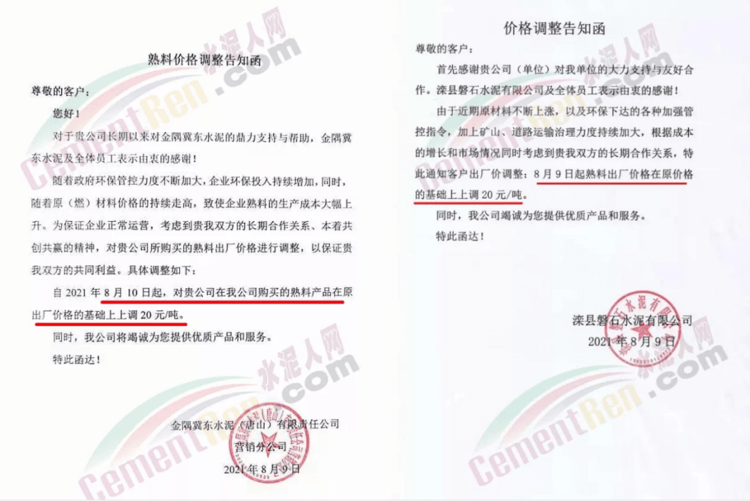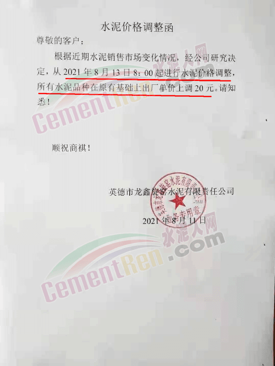 同期,水泥價格也出現跟漲。8月12日四川億鑫聯水泥有限公司通知,由于當前市場變化情況,經公司研究決定,自8月13日旱上7時起,對公司袋裝、散裝水泥在原價格基礎上上調50元/噸。價格調整后,如您繼續安排車輛到公司提貨,則視為確認本次價格調整。