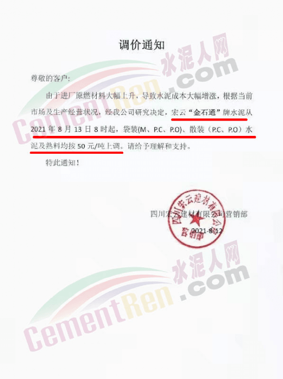 四川宏云建材有限公司營銷部通知由于進廠原燃材料大幅上升,導致水泥成本大幅增漲,根據當前市場及生產經營狀況,經公司研究決定,宏云“金石通”牌水泥從8月13日8時起,袋裝(M、P.C、P.O)、散裝(P.C、P.O)水泥及熟料均按50元/噸上調。