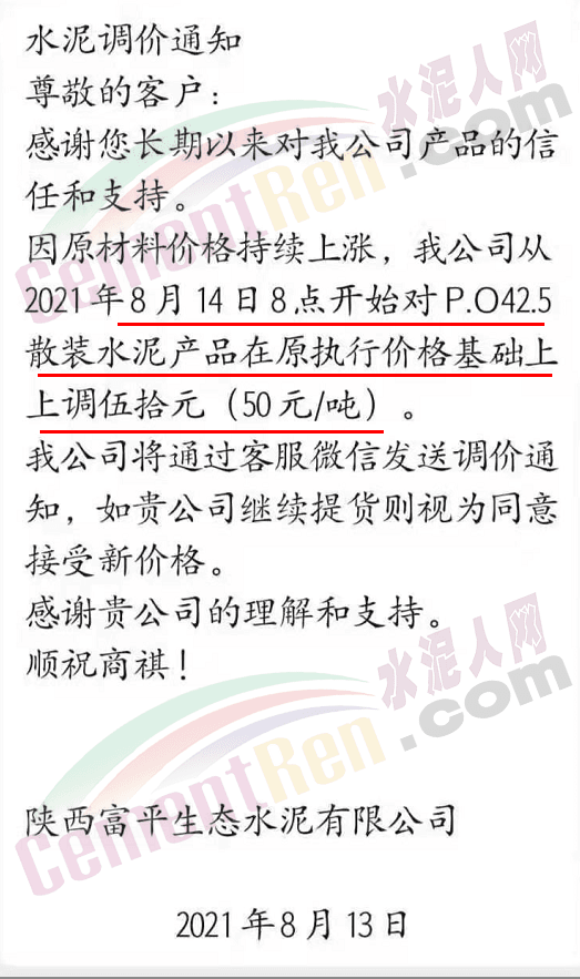 陜西富平生態水泥有限公司通知因原材料價格持續上漲,公司從2021年8月14日8點開始對P.O42.5散裝水泥產品在原執行價格基礎上上調50元/噸。公司將通過微信方式發送調價通知,如繼續提貨則視為同意接受新價格。