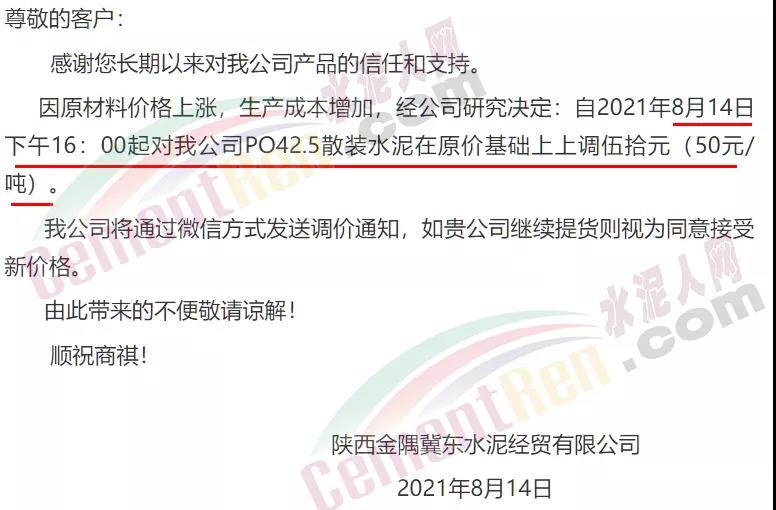 陜西金隅冀東水泥經貿有限公司通知,因原材料價格上漲,生產成本增加,經公司研究決定,自2021年8月14日下午16時起PO42.5散裝水泥在原價基礎上上調50元/噸。公司將通過微信方式發送調價通知,如繼續提貨則視為同意接受新價格。