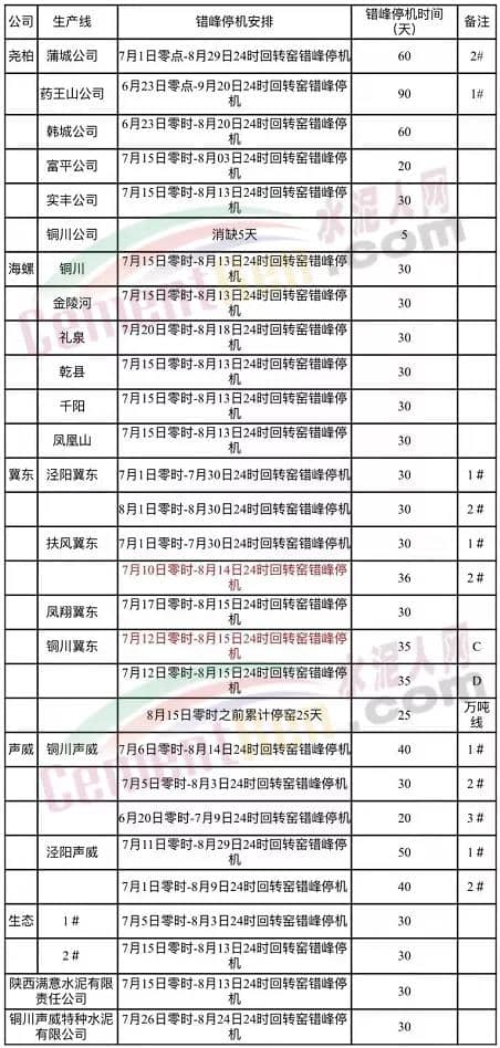《通知》結合陜西省水泥行業運行規律和各企業實際情況制定了具體的“水泥熟料生產線錯峰生產計劃表”,要求關中地區堯柏、海螺、冀東、聲威等29條水泥熟料生產線自6月20日零時起安排錯峰停產,最高停產90天。其中銅川冀東萬噸線于8月15日零時之前累計停窯25天。