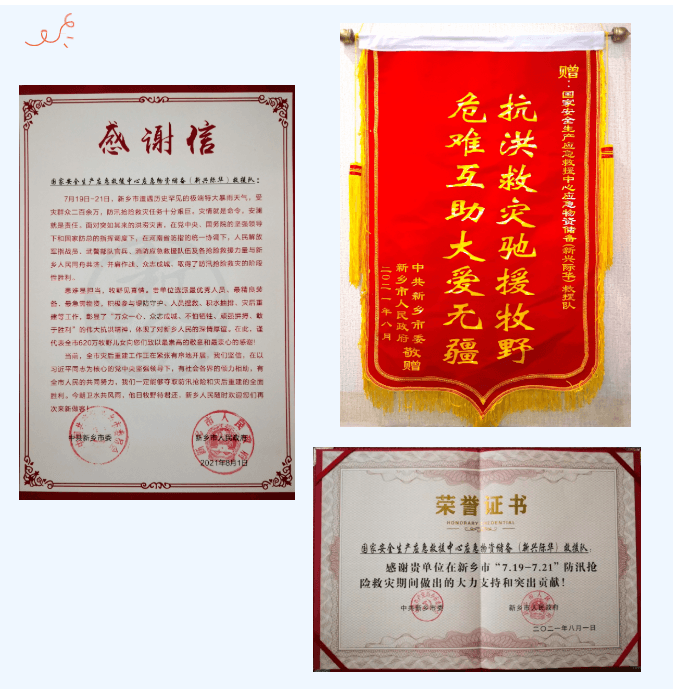 8月4日,新鄉市委、市政府向新興際華防汛救災應急救援隊給新興際華集團有限公司送來了感謝信、榮譽證書、錦旗,感謝企業第一時間派出最優秀人員、最精良裝備馳援新鄉防汛救災,并贊揚救援隊“患難顯擔當牧野見真情”。