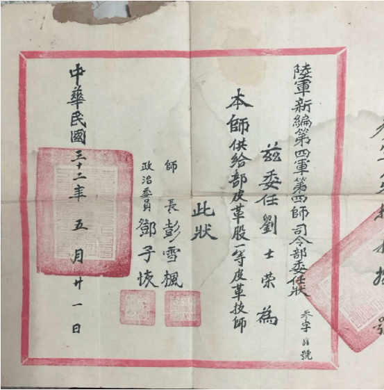 △新四軍四師師長彭雪楓、政委鄧子恢授予3521廠老廠長劉士榮的委任狀