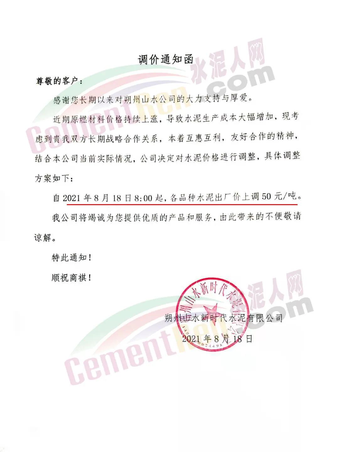 昨日(8月18日)朔州山水新時(shí)代水泥有限公司通知,近期原燃材料價(jià)格持續(xù)上漲,導(dǎo)致水泥生產(chǎn)成本大幅增加,自2021年8月18日8時(shí)起,各品種水泥出廠價(jià)上調(diào)50元/噸。