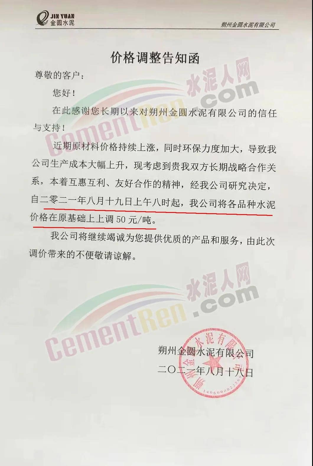 朔州金圓水泥有限公司通知近期原材料價(jià)格持續(xù)上漲,同時(shí)環(huán)保力度加大,導(dǎo)致公司生產(chǎn)成本大幅上升,經(jīng)公司研究決定,自2021年8月19日上午8時(shí)起,將各品種水泥價(jià)格在原基礎(chǔ)上上調(diào)50元/噸。