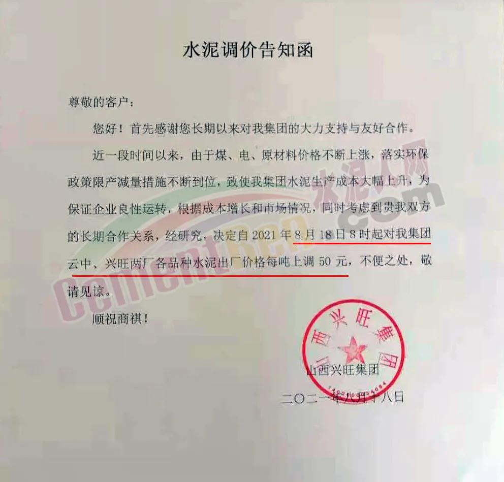 山西興旺集團(tuán)通知稱,近一段時(shí)間以來(lái),由于煤、電、原材料價(jià)格不斷上漲,落實(shí)環(huán)保政策限產(chǎn)減量措施不斷到位,致使企業(yè)水泥生產(chǎn)成本大幅上升,為保證企業(yè)良性運(yùn)轉(zhuǎn),根據(jù)成本增長(zhǎng)和市場(chǎng)情況,經(jīng)研究決定自2021年8月18日8時(shí)起對(duì)集團(tuán)云中、興旺兩廠各品種水泥出廠價(jià)格上調(diào)50元/噸。