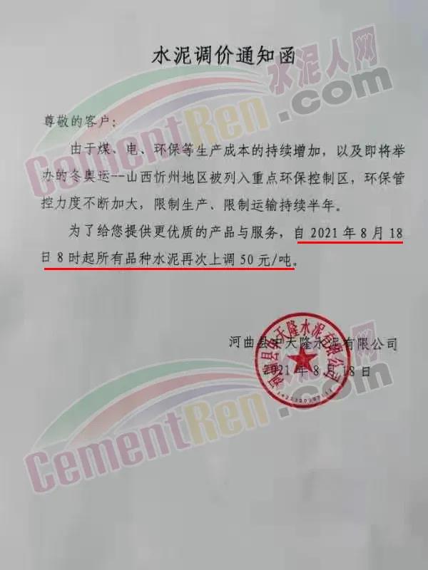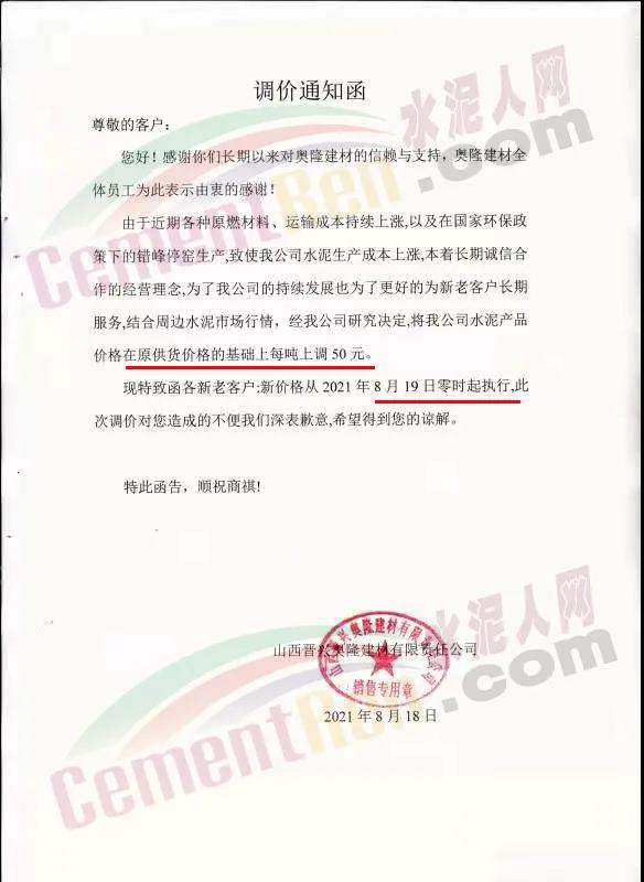 山西晉興奧隆建材有限責(zé)任公司通知,由于近期各種原燃材料、運(yùn)輸成本持續(xù)上漲,以及在國(guó)家環(huán)保政策下的錯(cuò)峰停窯生產(chǎn),致使公司水泥生產(chǎn)成本上漲,結(jié)合周邊水泥市場(chǎng)行情,經(jīng)公司研究決定,將水泥產(chǎn)品價(jià)格在原供貨價(jià)格的基礎(chǔ)上上調(diào)50元/噸,新價(jià)格從2021年8月19日零時(shí)起執(zhí)行。