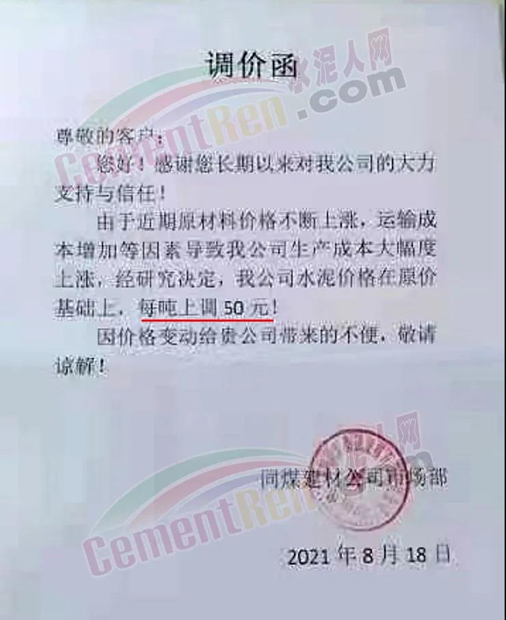 同煤建材公司市場(chǎng)部通知,由于近期原材料價(jià)格不斷上漲,運(yùn)輸成本增加等因素導(dǎo)致公司生產(chǎn)成本大幅度上漲,經(jīng)研究決定公司水泥價(jià)格在原價(jià)基礎(chǔ)上上調(diào)50元/噸。