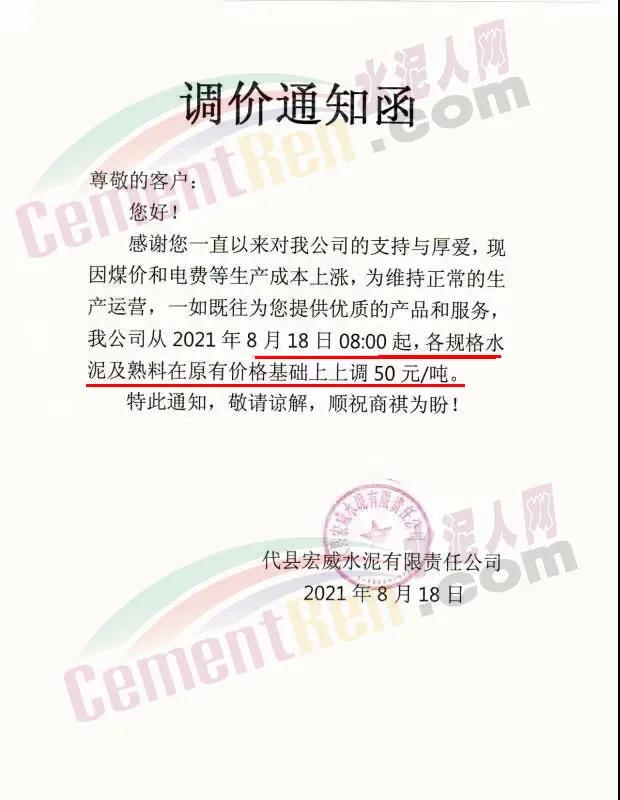 代縣宏威水泥有限責(zé)任公司通知,因煤價(jià)和電費(fèi)等生產(chǎn)成本上漲,為維持正常的生產(chǎn)運(yùn)營(yíng),公司從2021年8月18日8時(shí)起,各規(guī)格水泥及熟料在原有價(jià)格基礎(chǔ)上上調(diào)50元/噸。
