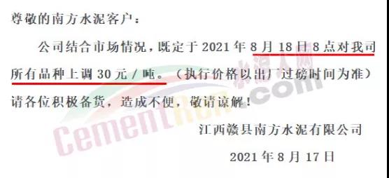 江西贛縣南方水泥有限公司通知于2021年8月18日8點(diǎn)對(duì)公司所有品種上調(diào)30元/噸。