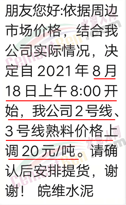 皖維水泥通知,依據(jù)周邊市場(chǎng)價(jià)格,結(jié)合公司實(shí)際情況,決定自2021年8月18日上午8時(shí)開(kāi)始,公司2號(hào)線、3號(hào)線熟料價(jià)格上調(diào)20元/噸。
