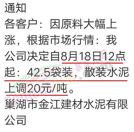 巢湖市金江建材水泥有限公司通知稱,因原料大幅上漲,根據(jù)市場(chǎng)行情公司決定自8月18日12點(diǎn)起42.5袋裝,散裝水泥上調(diào)20元/噸。