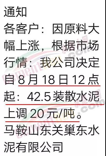 馬鞍山東關(guān)巢東水泥有限公司通知因原料大幅上漲,根據(jù)市場(chǎng)行情公司決定自8月18日12點(diǎn)起42.5裝散水泥上調(diào)20元/噸。