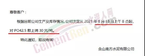 含山南方水泥有限公司通知根據(jù)目前公司生產(chǎn)及庫(kù)存情況公司決定從2021年8月18日上午8點(diǎn)起,對(duì)PO42.5散上調(diào)30元/噸。