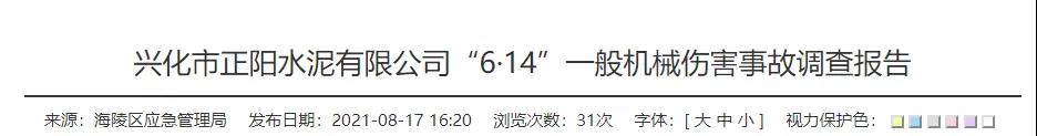 經調查認定,興化市正陽水泥有限公司“6.14”一般機械傷害事故是一起生產安全責任事故。