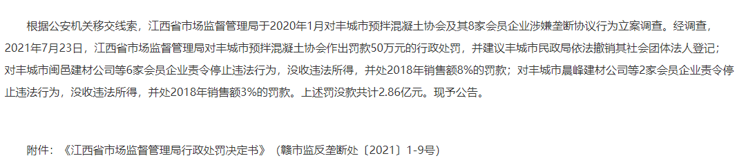 經調查,2021年7月23日,江西省市場監督管理局對豐城市預拌混凝土協會作出罰款50萬元的行政處罰,并建議豐城市民政局依法撤銷其社會團體法人登記;對豐城市閩邑建材公司等6家會員企業責令停止違法行為,沒收違法所得,并處2018年銷售額8%的罰款;對豐城市晨峰建材公司等2家會員企業責令停止違法行為,沒收違法所得,并處2018年銷售額3%的罰款。上述罰沒款共計2.86億元。