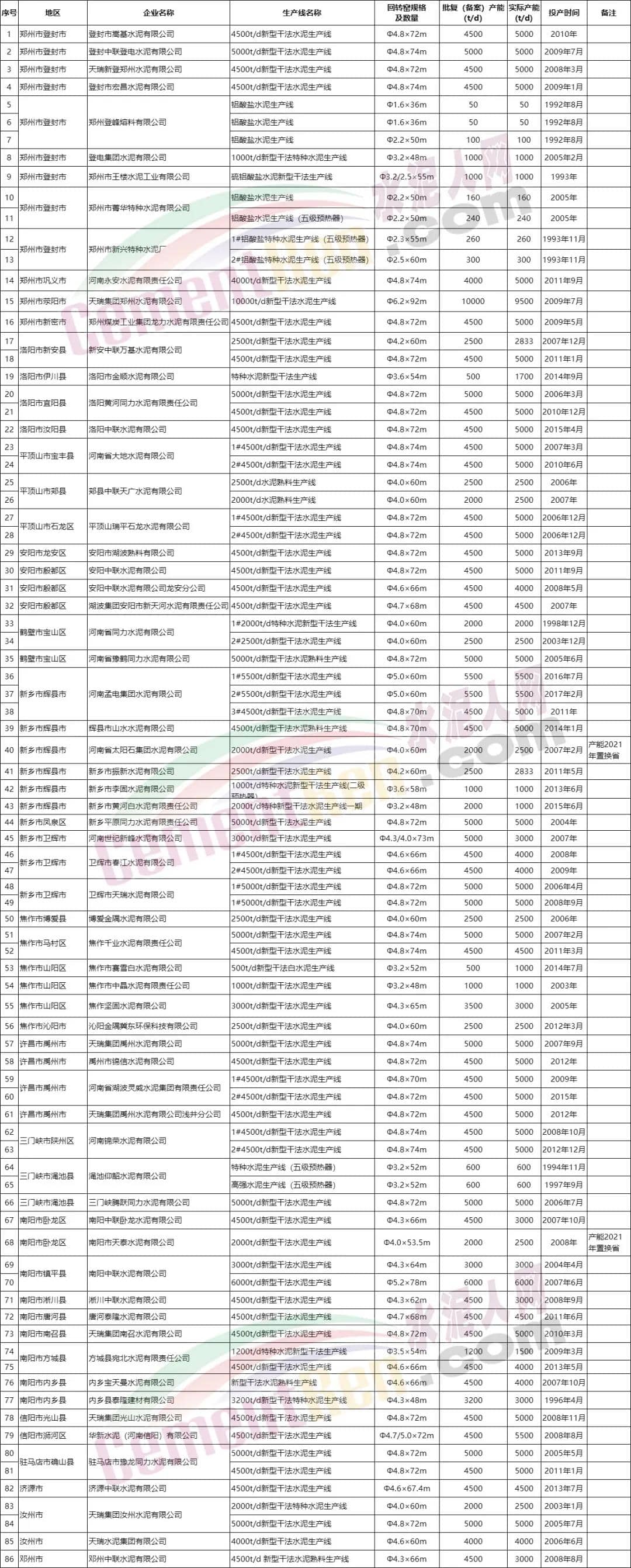 清單顯示,河南省內共有86條熟料生產線,批復(備案)產能合計達9202.8萬噸/年,實際產能達9426.78萬噸/年,其中河南省太陽石集團水泥有限公司和南陽市天泰水泥有限公司各一條2000t/d新型干法水泥生產線產能2021年置換省外。