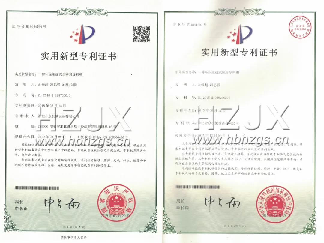 此外,作為一家專注于智能環保輸送裝備粉塵治理的綜合性企業,淮北合眾一直以來非常重視技術創新,其自主研發的“環保承載式全密封導料槽”榮獲由國家知識產權局頒發的兩項實用新型專利。