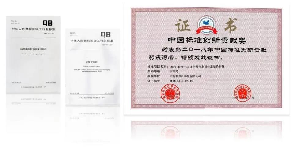 豐博自動化是一家從事動態計量行業20多年的老牌企業,成立了動態計量研究院,并擁有完備的固體顆粒狀物料連續計量的實驗裝置和先進的粉體連續計量實驗裝置。在計量研究上,榮獲多項國家專利及軟件著作權。并且,由經河南省質量技術監督局推薦,豐博自動化負責牽頭領銜制定的行業標準《QB/T4770-2014科里奧利粉體定量給料秤》項目,榮獲2018年中國標準創新貢獻獎三等獎。