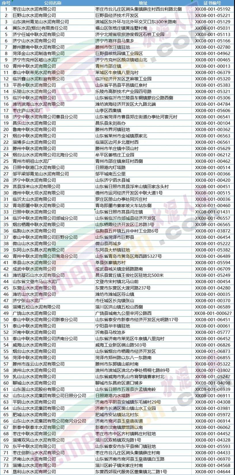根據國家市場監管總局工業品生產許可證辦公室數據顯示,山東省內共有包括單體粉磨站、特種水泥生產線在內的300家企業。其中包括中建材中國聯合水泥集團下屬泰安中聯、青州中聯、臨沂中聯、濟寧中聯、魯南中聯、煙臺中聯、日照中聯、菏澤中聯、棗莊中聯等近30家水泥企業;山東山水水泥旗下濟南山水、棗莊山水、巨野山水、煙臺山水、臨朐山水、東營山水、濰坊山水、威海山水、聊城山水、日照山水、平陰山水、淄博山水等29家企業,以及濟寧海螺水泥和冀東水泥煙臺公司。