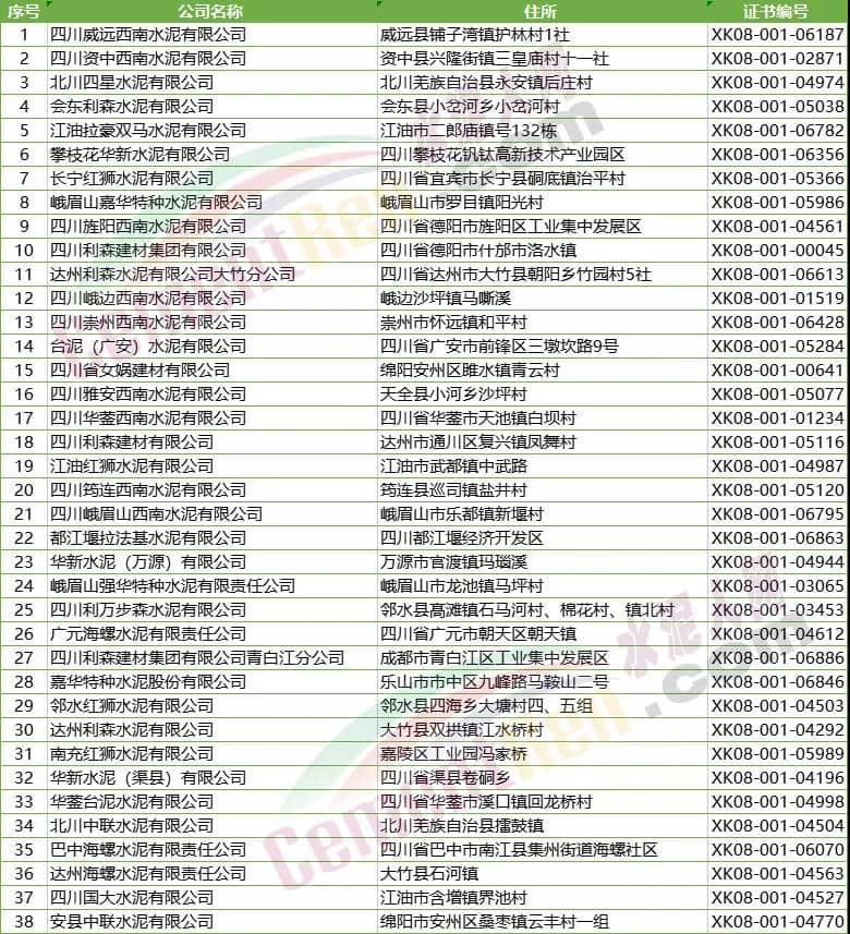 國家市場監管總局工業品生產許可證辦公室數據顯示,四川省內共有包括單體粉磨站、特種水泥生產線在內的145家水泥企業。其中包括中建材西南水泥旗下威遠西南、資中西南、旌陽西南、峨邊西南、崇州西南、雅安西南、華鎣西南、筠連西南、峨眉山西南、達州利森、女媧建材、北川中聯等;海螺水泥旗下廣元、巴中、達州公司;臺泥水泥旗下臺泥(廣安)水泥公司、華鎣臺泥公司;華新水泥旗下攀枝花華新水泥、華新水泥(萬源)公司、華新水泥(渠縣)公司、拉法基水泥;紅獅水泥長寧公司、江油公司、鄰水公司、南充公司以及嘉華特種水泥、雙馬水泥、四川亞東水泥、星船城水泥等。