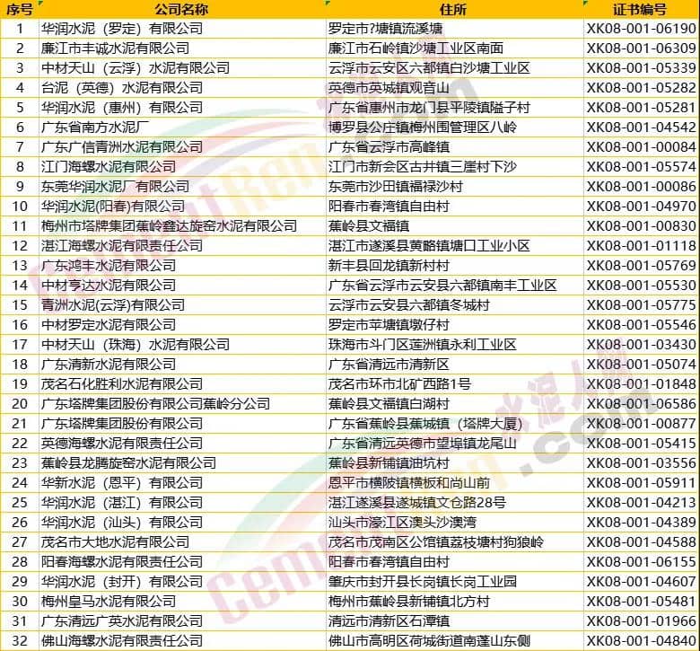 國家市場監管總局工業品生產許可證辦公室數據顯示,廣東省內共有包括單體粉磨站、特種水泥生產線在內的178家水泥企業。其中包括華潤水泥羅定、惠州、東莞、陽春、湛江、汕頭、封開;海螺水泥旗下江門、湛江、英德、陽春、佛山公司、清新水泥;中材水泥旗下云浮天山、珠海天山、中材亨達、中材羅定以及塔牌集團下屬集團焦嶺公司、臺泥英德、華新恩平、青州水泥等主要品牌企業。