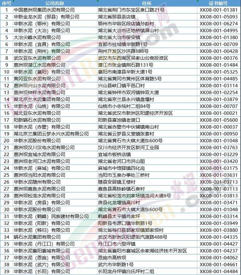 國家市場監管總局工業品生產許可證辦公室數據顯示,湖北省內共有包括單體粉磨站、特種水泥生產線在內的120多家水泥企業。其中包括華新水泥旗下黃石、陽新、秭歸、大冶、宜昌、鄖縣、鄂州、荊州、襄陽、仙桃、赤壁、麻城、隨州、房縣、鶴峰、丹江口、恩施、武穴、長陽等20余家企業;葛洲壩集團旗下荊門、潛江、興山、鐘祥、漢川、宜城、老河口、當陽、嘉魚、松滋等10余家水泥企業;亞東水泥武漢公司、黃岡公司等。以及新投產的華新黃石萬噸線和即將投入新建項目的媧石水泥。