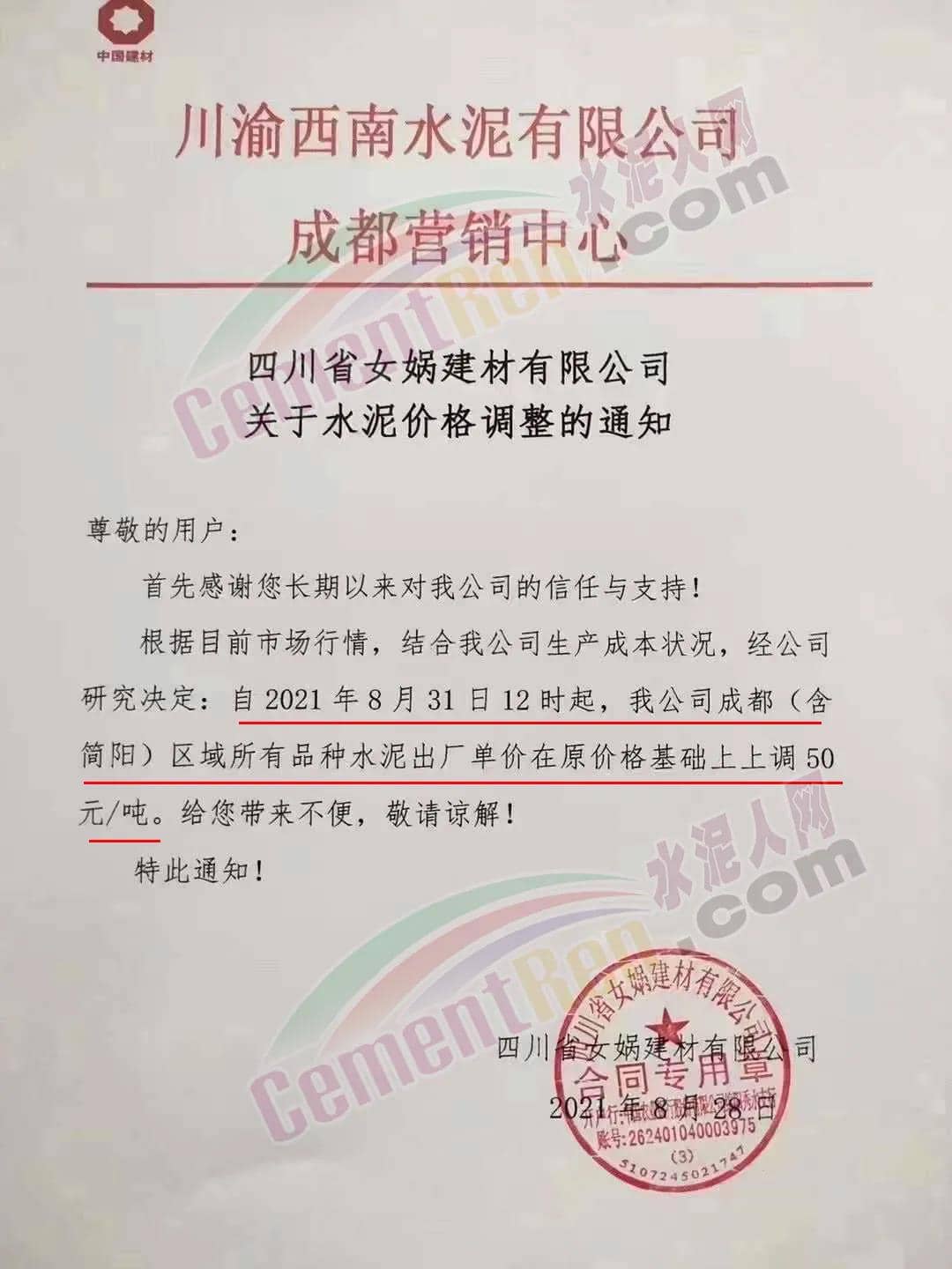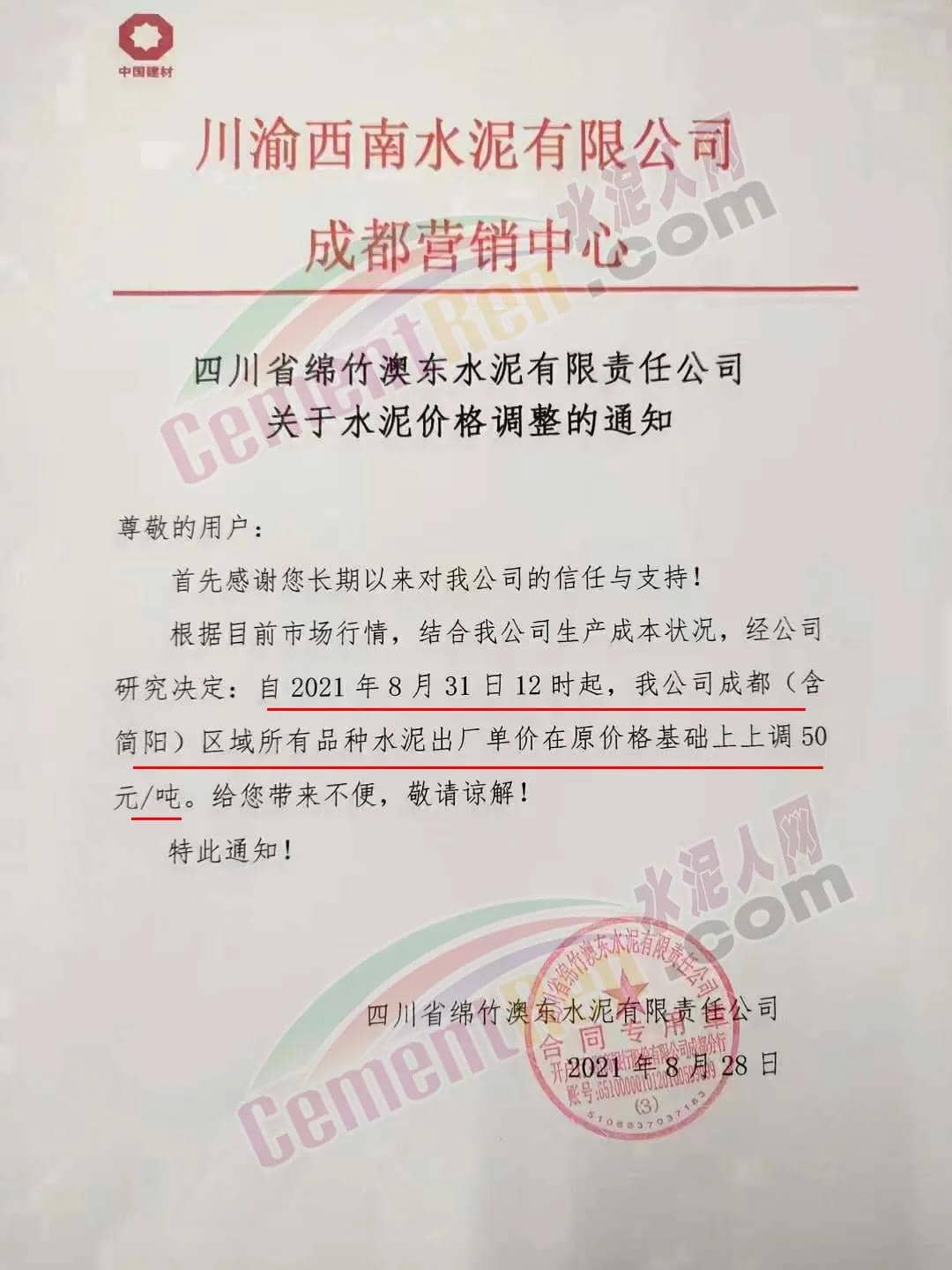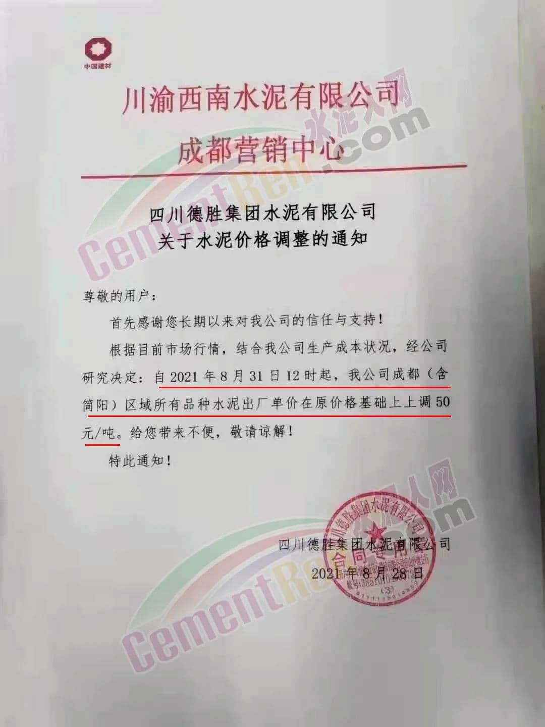 安縣中聯水泥、崇州西南水泥、四川德勝集團、峨眉山西南水泥、四川利森集團、綿竹澳東水泥、女媧建材等通知稱,根據目前市場行情 ,結合公司生產成本狀態,經公司研究決定自8月31日12時起,成都(含簡陽)區域所有品牌水泥出廠單價在原價基礎上上調50元/噸。