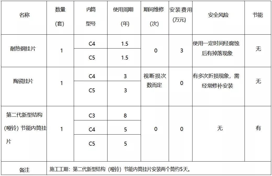 3、第二代新型結(jié)構(gòu)(啞鈴)節(jié)能內(nèi)筒掛片:采用金屬陶瓷構(gòu)架,經(jīng)內(nèi)外特種澆注料壓制及1400℃高溫?zé)贫桑J褂们闆r下 C4、C5 內(nèi)筒質(zhì)保五年,C4實(shí)際壽命大于七年、C5實(shí)際壽命大于六年以上期間無需任何維修,具有密封性能好、耐磨性能強(qiáng)、耐高溫、耐腐蝕,且抗沖擊能力強(qiáng)、降低負(fù)壓有明顯的效果。