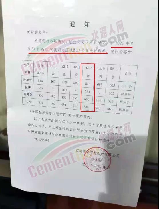 西藏高爭建材股份有限公司通知8月31日8時起公司對區域配送價格進行調整。調整后P.O42.5散裝水泥出廠掛牌價520元/噸,到位價拉薩市場執行520元/噸,日喀則市場執行550元/噸,山南市場執行535元/噸,地區配送價格僅限市區10公里范圍內。