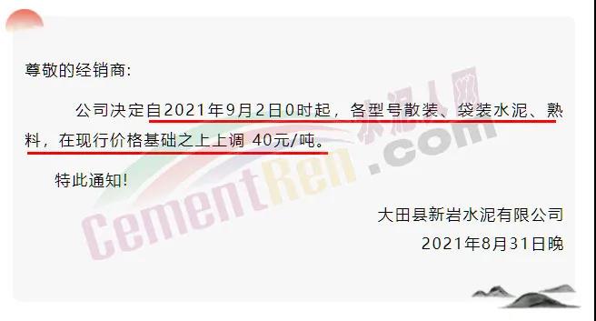 大田縣新巖水泥有限公司通知稱,公司決定自2021年9月2日0時起,各型號散裝、袋裝水泥、熟料,在現行價格基礎之上上調 40元/噸。