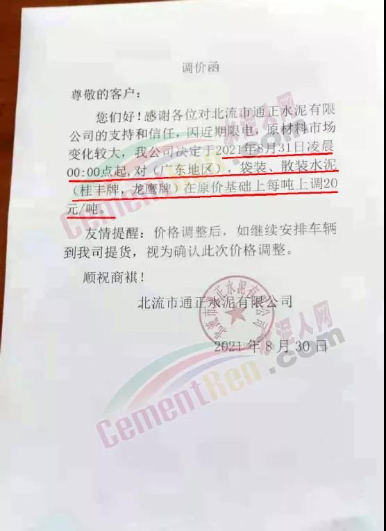 北流市通正水泥有限公司通知稱,因近期限電,原材料市場變化較大,公司決定于2021年8月31日凌晨0時起,對(廣東地區),袋裝、散裝水泥(桂豐牌,龍鷹牌)在原價基礎上上調20元/噸。
