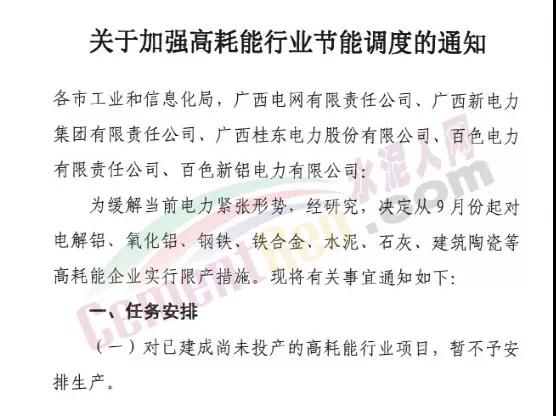日前,廣西壯族自治區工信廳發布《關于加強高耗能行業節能調度的通知》給各市工業和信息化局,廣西電網有限責任公司、廣西新電力集團有限責任公司、廣西桂東電力股份有限公司、百色電力有限責任公司、百色新鋁電力有限公司稱,為緩解當前電力緊張形勢,決定從9月份起對電解鋁、氧化鋁、鋼鐵、鐵合金、水泥、石灰、建筑陶瓷等高耗能企業實行限產措施。