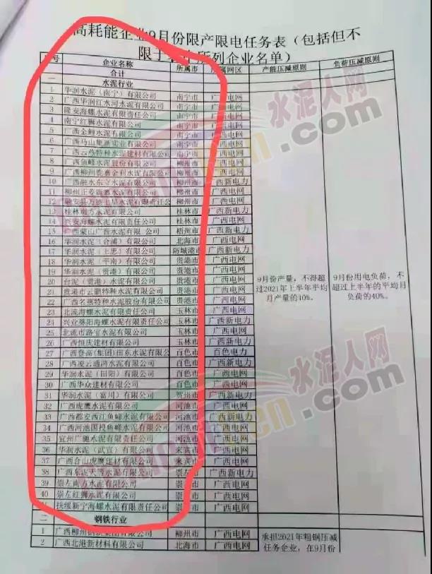 自治區將按旬實行節能調度,對于9月未完成限產任務進度或超過產品能耗限額的企業,立即停止當月供電;對于未完成月限產任務的企業,下月不再安排用電計劃。高耗能企業9月份限產限電任務表(包括但不限于表中所列企業名單)如下:
