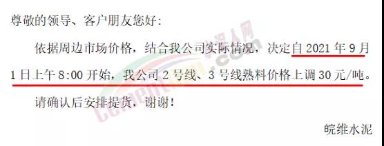 同日,安徽皖維水泥通知,自2021年9月1日上午8:00開始,公司2號線、3號線熟料價格上調30元/噸。