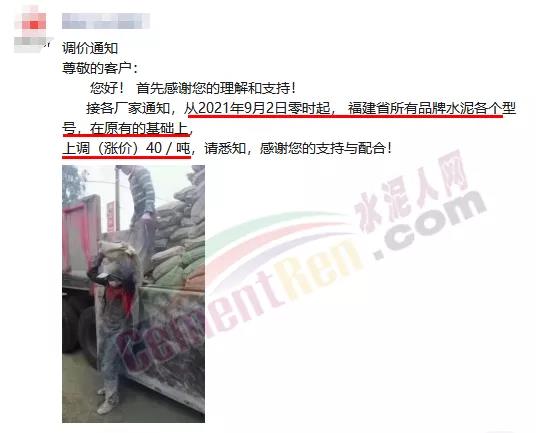 有經銷商發通知稱,從9月2日零時起 ,福建省內所有品牌水泥各個型號在原有基礎上上調40元/噸。