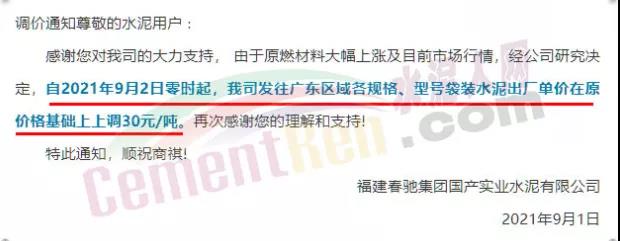 其中,福建春馳集團國產實業水泥有限公司通知稱,由于原燃材料大幅上漲及目前市場行情,經公司研究決定,自2021年9月2日零時起,發往廣東區域各規格、型號袋裝水泥出廠單價在原價格基礎上上調30元/噸。