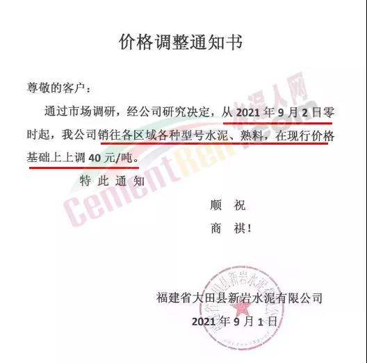 福建省大縣田新巖水泥有限公司通知通過市場調研,經公司研究決定,從9月2日零時起公司銷往各區域各型號水泥、熟料在現行價格基礎上上調40元/噸。